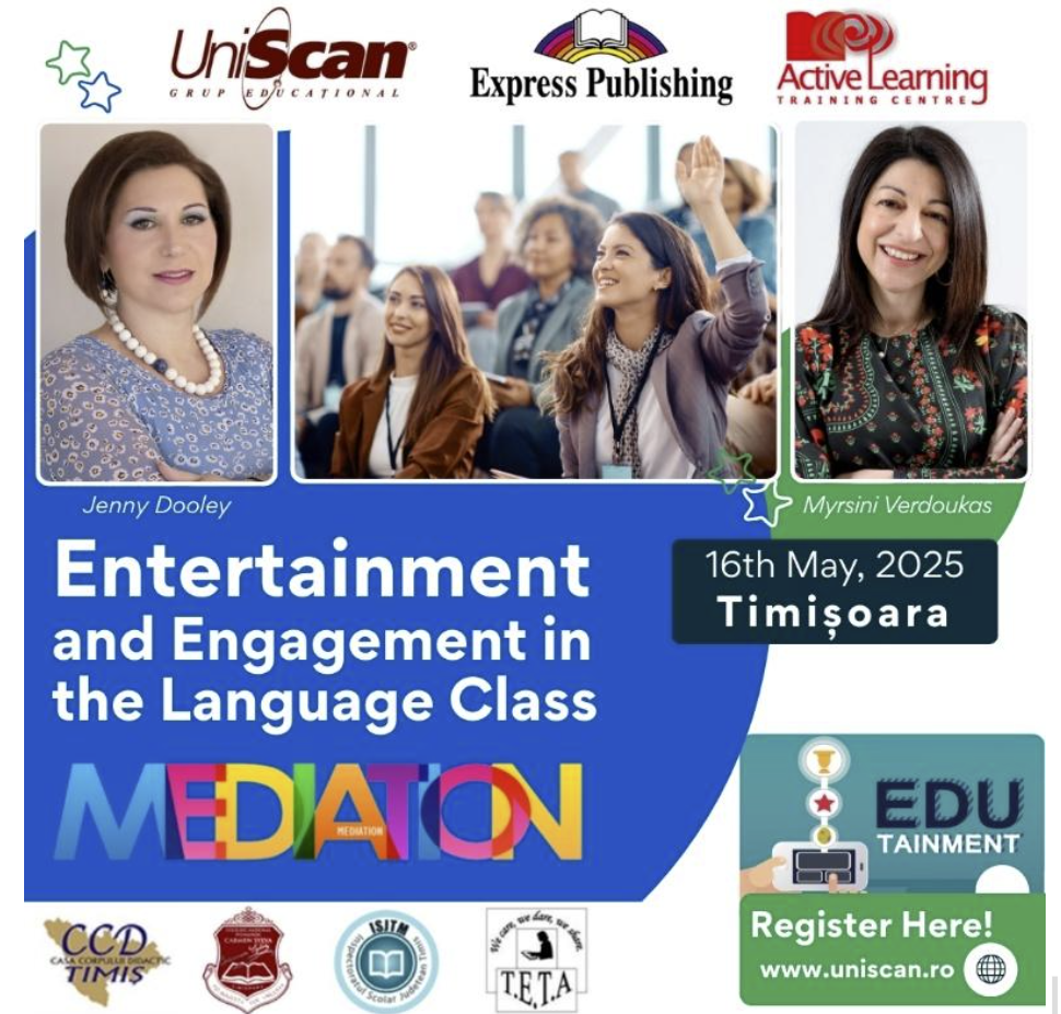 Casa Corpului Didactic Timiș, în parteneriat cu Uniscan Grup Educațional SRL, I.Ș.J. Timiș, Timiș English Teachers Association și Colegiul Național Pedagogic „Carmen Sylva” din Timișoara vă invită la seminarul Entertainment and Engagement in the Language Class, organizat în data de 16.05.2025, în intervalul orar 14:30 – 17:30, la Colegiul Național Pedagogic „Carmen Sylva” din Timișoara.